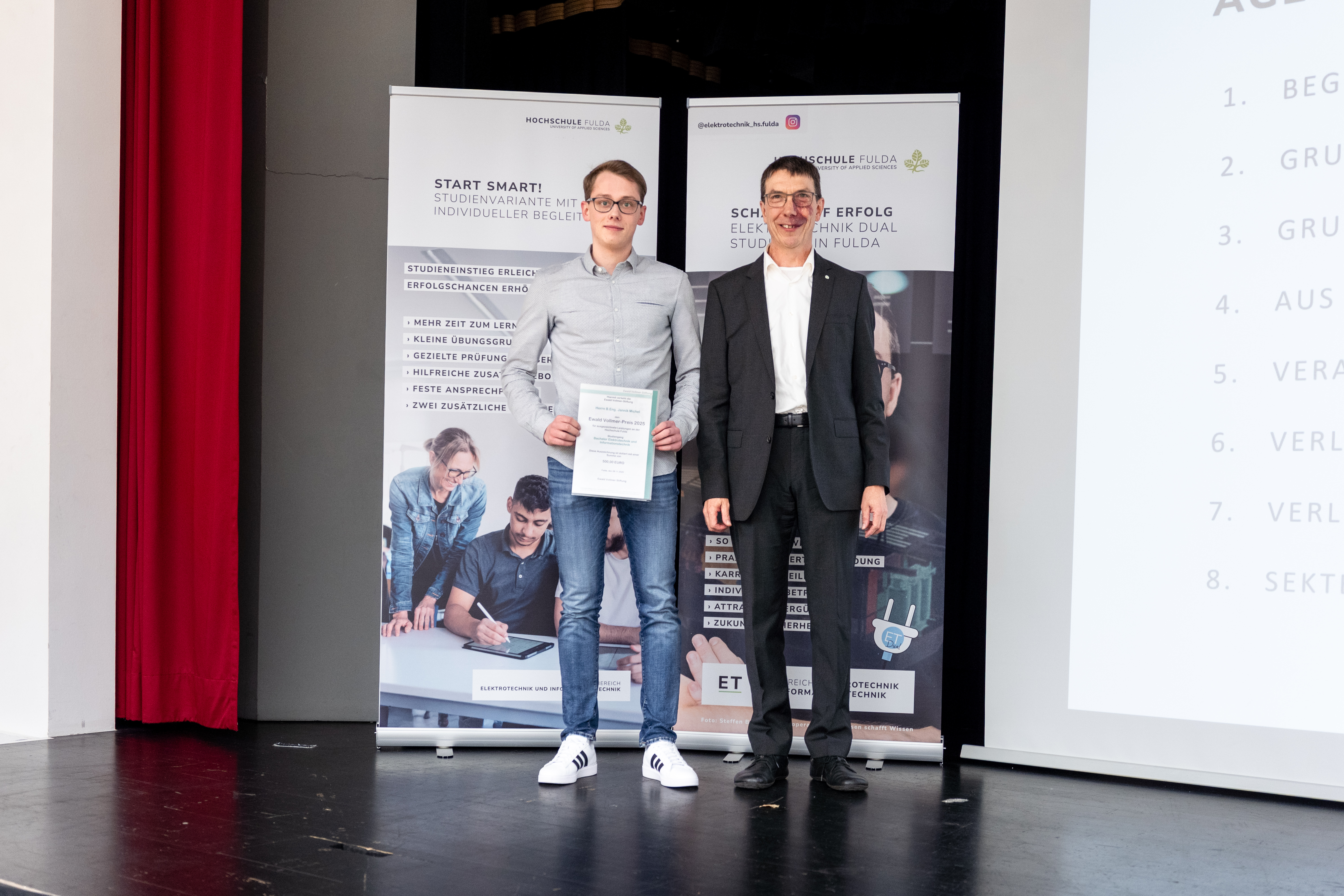 Auch in diesem Jahr wurden die besten Abschlussarbeiten im Bachelor- und Masterbereich mit dem Friedrich-Dessauer-Preis des VDE Rhein-Main ausgezeichnet, welcher fachlich herausragende wissenschaftliche Arbeiten würdigt. Der Preis wurde von Dipl.-Ing. Matthias Hahner, dem Geschäftsführer der OsthessenNetz GmbH und Vorstandsmitglied des VDE Region Ost Fulda/Hanau (Verband der Elektrotechnik Elektronik Informationstechnik e. V.) überreicht.